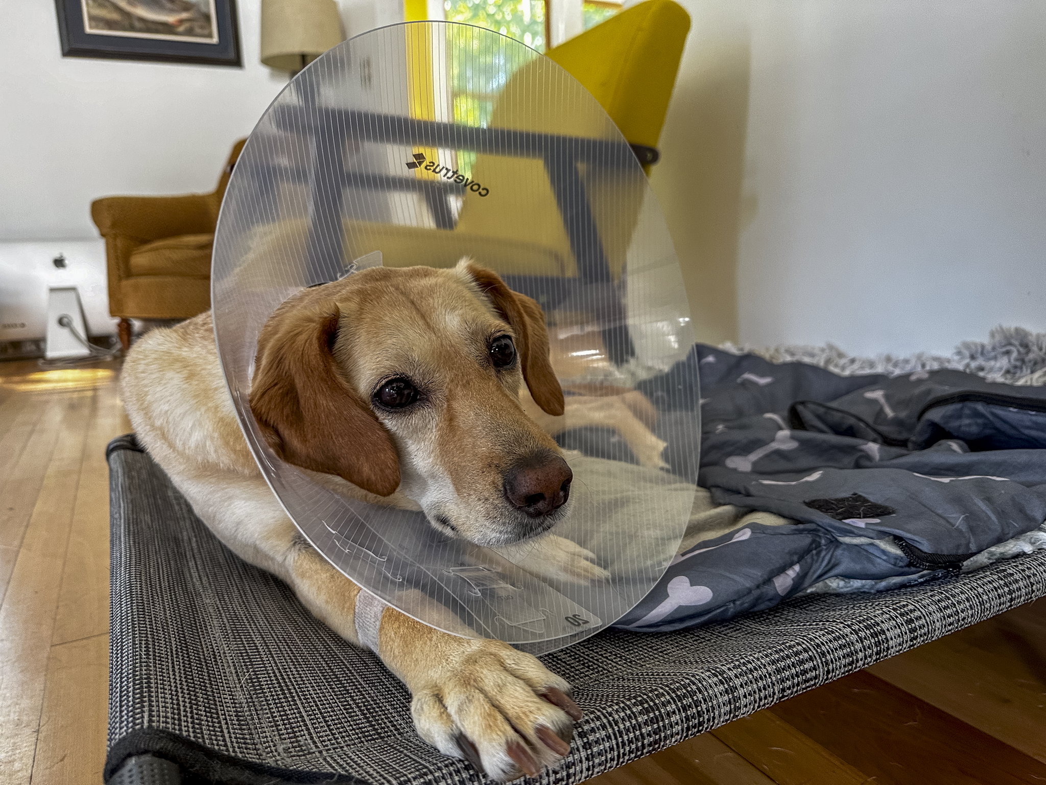 In June of 2023, she tore her left CCL (similar to human ACL), so we headed to the emergency vet. CCL tears are very common injuries with a 2009 estimate by the Journal of the American Veterinary Medical Association estimating that about one million CCL surgeries are performed per year (AP). The cost for surgical repair? $7,000. The alternative would have been that she would never regain full use of that leg. Additional cartilage damage and scar tissue would accumulate over time, further reducing her mobility. She would not be able to hike or zoom again. After consulting with her longtime veterinarian, as a professional and then as a friend, I went ahead and scheduled the surgery.